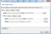 • SampleFilter.png Set Sample Filter: Opens a window to select a filter. Only Samples that match the filter criteria (e.g., coverage, etc.) are displayed in the table and used in distance calculations. Clear filter to reconstitute all Samples again