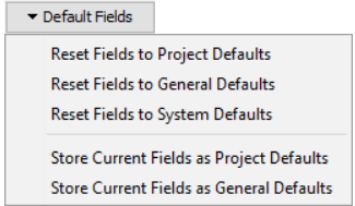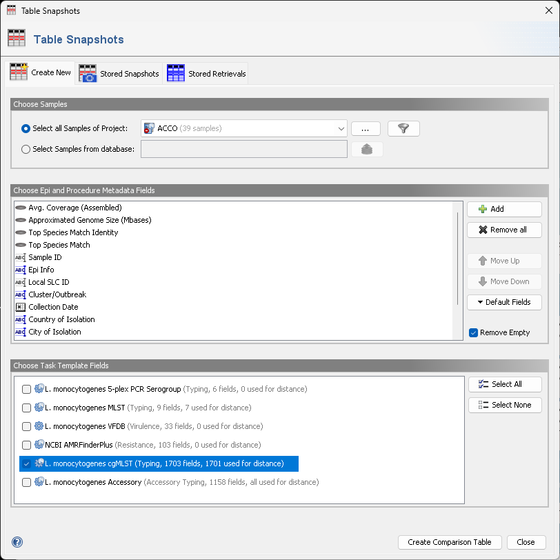 When creating a new comparison table or using a stored retrieval, the list of Epi and Procedure Metadata Fields starts with the general default fields, or with the specific project default fields if defined in the project definition for the selected project. The drop down button Button16-SmallDown.gif Default Fields can be used to change the current list of selected fields to the project defaults, the general defaults, or the unchangeable system defaults. It can also be used to overwrite the project defaults or the general defaults with the current selection of fields. By default, the option Remove Empty is enabled, so that any columns that are empty in all samples will be removed automatically.