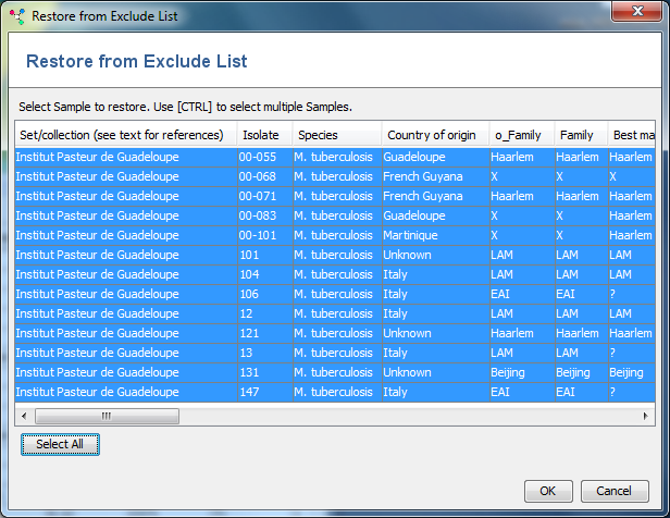 • RestoreExcludeList.png Restore from Exclude List: Opens a window with all Samples in the exclude list and the option to remove Sample(s) from this. Those Sample(s) are re-added to the comparison table. Hint: Use CTRL to select multiple Samples