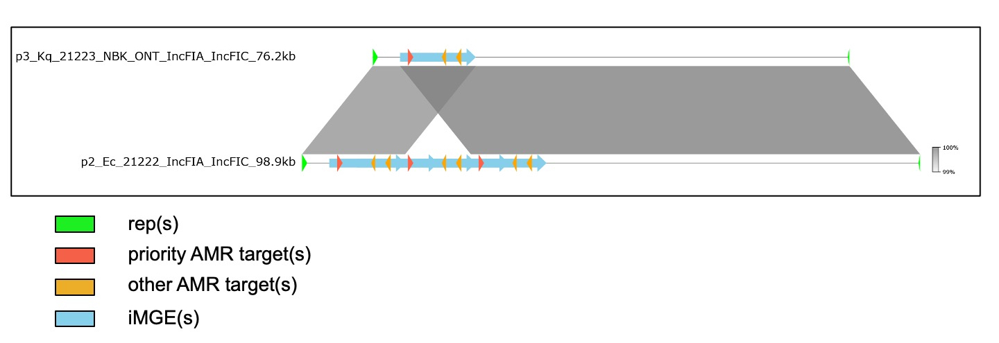 For users with the Long-read Data Plasmid Transmission Analysis Module, the visualization can also be started from a Plasmid Table, where it can be used to directly compare selected plasmids. If the visualization is used that way, genes and their positions are retrieved from other Task templates and highlighted in different colors: rep(s) from the Chromosome & Plasmid Overview (green), AMR genes from the NCBI AMRFinderPlus (priority genes: red, other: orange), and mobile genetic elements that contain priority AMR targets from the CGE MobileElementFinder (light blue).