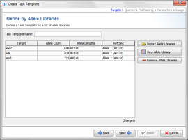 One target is created for each allele library. An Allele Typing query library using the given alleles is added to the created Task Template. Note that this query library cannot be expanded by new query results.