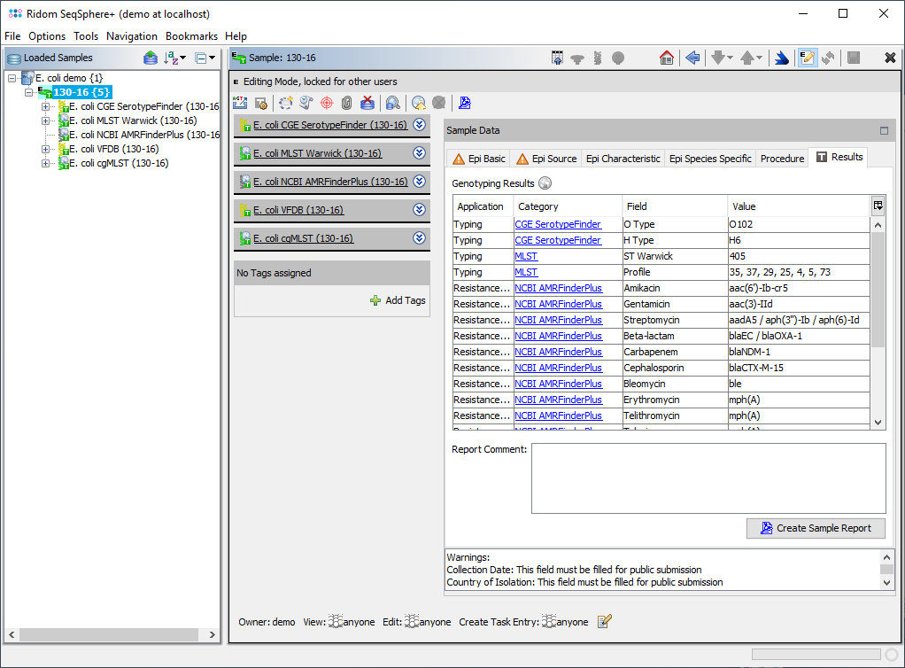 Only the two fields 'O Type' and 'H Type' are shown in the result tab of the Sample Overview. However, by clicking the CGE SerotypeFinder category links all details for this sample can be viewed. All 29 result fields can be exported and selected from the CGE SerotypeFinder entry for searching under 'Field Criteria' in the advanced mode of the sample search dialog. Only the two fields 'O Type' and 'H Type' are shown by default in a comparison table (with gray column header) when the task template was chosen. However, if needed the other 27 gene specific result fields can be added to a comparison table using the advanced settings. |