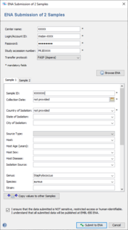 The first 3 values are stored per Ridom Typer user in the database and can be edited with the menu item Options | User Settings. The study accession number must be entered manually for each submission. The study must already be existing. New studies and accounts can be created manually at ENA Webin. The transfer protocol default value is FTP which can be changed to FASP (Aspera) as described below in IBM Aspera section. Initial editor values are taken from the Sample's data fields and from the Procedure Details, anonymized according to the settings in the Submission Anonymization Filter. The Copy values to other editors button can be used to copy data from the editor in the currently selected tab to all other editors. Make sure the box next to "I ensure that the data submitted is ..." is selected, then click OK to start the submission to ENA. If the Samples use a Database Scheme that contains the field EBI/NCBI Accession(s), the ENA run accession numbers are appended to this field.