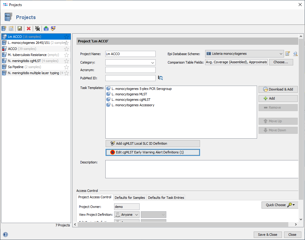 EWAs can be added and deleted at any time when in the project manger window a project is selected and the Edit cgMLST Early Warning Alert Definitions button of this project is pushed. For adding a EWA the Button16-Plus.gif icon must be pushed and the new EWA must be defined. For deleting an EWA the corresponding tab must be selected and the Button16-Minus.gif icon must be pushed. Once the buttons OK of the Edit cgMLST Early Warning Alert Definitions dialog and Save & Close of the project dialog are clicked the definition is added or deleted.