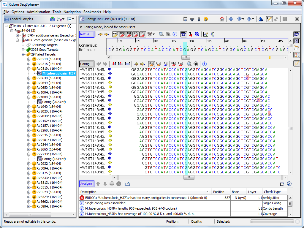 DNA re-sequencing editorWGS data: Assemble data using the integrated de-novo Assembler Velvet or Spades, or the BWA reference mapper. Edit and analyze assembled DNA sequences (e.g., for MLST or cgMLST typing). Auto-correction of homopolymer related InDel errors (Ion PGM & 454 GS Junior). Sanger data: Assemble, edit and analyze Sanger CE sequencing data (e.g., for 16S rDNA or MLST typing). Chromatograms can be automatically assembled into contigs using configurable file naming conventions. DatabaseStore, search, retrieve, export and create reports from your circumstantial information (e.g., place and time) and DNA sequence data stored in an integrated SQL database. Search new sequence entries against stored data. Data fields are compliant with the metadata requirements of the NCBI BioSample. Data entry plausibility checks are possible. Bacterial genotypingTyping of bacteria is automatically performed. Ridom Typer includes support for the following genotyping methods: MLST: Fetch allele numbers for sequences and STs from the PubMLST server or define a local MLST typing, e.g. for using new targets. cgMLST: Extension of MLST that uses thousands of targets, for a gene-by-gene allele typing of NGS data. Resistance, virulence, and serotyping: Genotypic resistance prediction by usage of the NCBI AMRFinderPlus, virulence typing via VFDB (that supports 54 species of medical importance), and Listeria monocytogenes and Escherichia coli serotyping. Automatic NCBI GenBank online queries: Compare the DNA sequences with best matches from GenBank. Single locus queries: Do single locus typing (SLST) and compare against libraries stored in the local database. Quality checkingQuality of DNA data can be automatically checked with user defined target QC parameters (e.g., coverage, intragenic stop codons, frame shifts detection). Analytical toolsSelect data entries from a comparison table for epidemiologic studies, evolutionary or functional analysis. Cluster and visualize data entries by using minimum spanning or UPGMA/Neighbor Joining trees. SecurityEncryption (SSL) of data in transmission. Various configurable user roles, user groups and access controls. Audit trail functionality (who, when and what). CommunityOption to contribute to a single world-wide expanding publically available database of nomenclature and epidemiologic data. Own server for epidemiologic data for larger (supra) national institutions on request. Rapidly and easily share task templates with other institutions or download them online from the Task Template Sphere. |