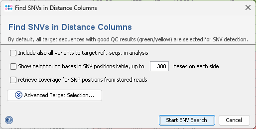 Next another Find SNVs in Distance Columns dialog window opens, that allows to specific the following options before the SNV search is conducted: