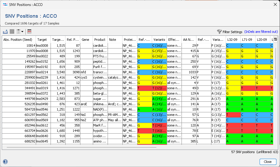 This hides all SNV positions that have an non-synonymous change in the amino acid at the SNV position (compared to Ref.-Seq. column). The synonym/non-synonym effect is also shown in the column Effect to Ref.-Seq.