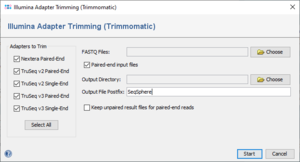 The presence of adapter sequences in next-generation sequencing (NGS) data significantly reduces the quality of assembling and other downstream analysis results. Therefore, in Ridom Typer Trimmomatic (citation) can be used to perform a trimming of Illumina adapter sequences in FASTQ read data. By default, adapter trimming is automatically performed in a pipeline if adapter sequences were found by FastQC with state 'warning' or 'failed'. It can also be disabled completely or it can be forced to be performed always and independently of FastQC. When performed in the pipeline, Trimmomatic searches for all adapter sequences provided with Ridom Typer (see below). After Trimmomatic was performed, the phrase 'adapters trimmed' is added to the procedure details field 'Assembler pre-processing'. Tools Menu FunctionTrimmomatic can also be performed manually by using the menu function Tools | Genome Utilities | Illumina Adapter Trimming (Trimmomatic). When the function is invoked, a dialog windows is opened. In the left part of the dialog the available adapter sequences are listed. The Illumina adapter sequences for Nextera and TruSeq library prep kits are distributed together with Trimmomatic. Multiple or even all adapter sequences can be selected at once. The following adapter sequences are provided: