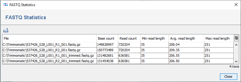 After Trimmomatic has finished a message dialog is shown. The button Show FASTQ Statistics in this dialog can be used to show the statistics (e.g., base count) for the input files and all created output files.