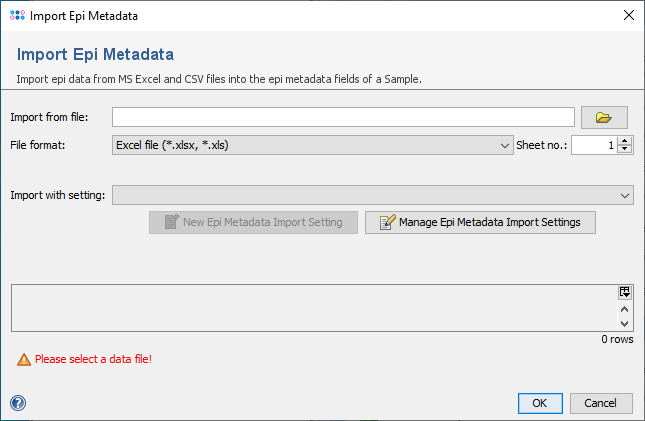 - An existing Epi Metadata Import Setting can be selected in the Import with setting box. Epi Metadata Import Settings with a different column count than the selected file cannot be used and are highlighted in red.