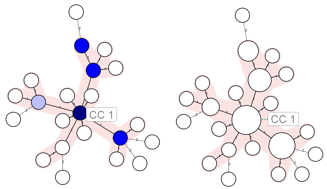 - Maximum distance in MST Cluster: The maximum distance two nodes can have if they are considered to be in the same cluster. For comparison tables that use only cgMLST distance columns, the CT distance is used as default for the maximum cluster distance.