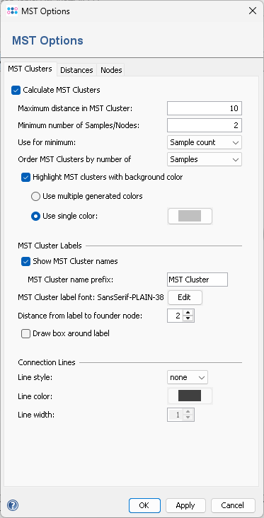 The MST Clusters and the visual appearance of a Minimum Spanning Tree (MST) can be modified using this window. The window contains three tabs for different groups of settings.