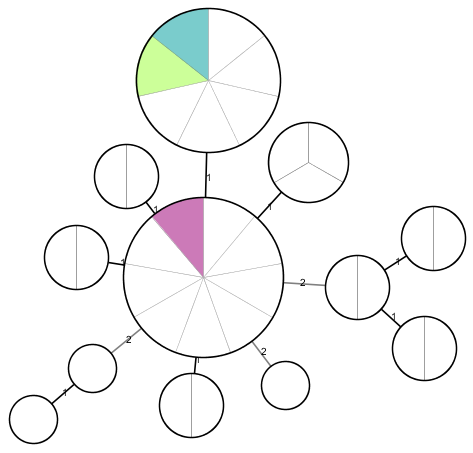 - The number of Samples in a node/genotype can be displayed using colors or by changing the size of the nodes. Six different colors can be used to display the number of Samples using color. If the number of Samples is displayed using the size of a node, the minimal size, the maximum size of the node and how much the size is increased for each Sample in a node can be specified.