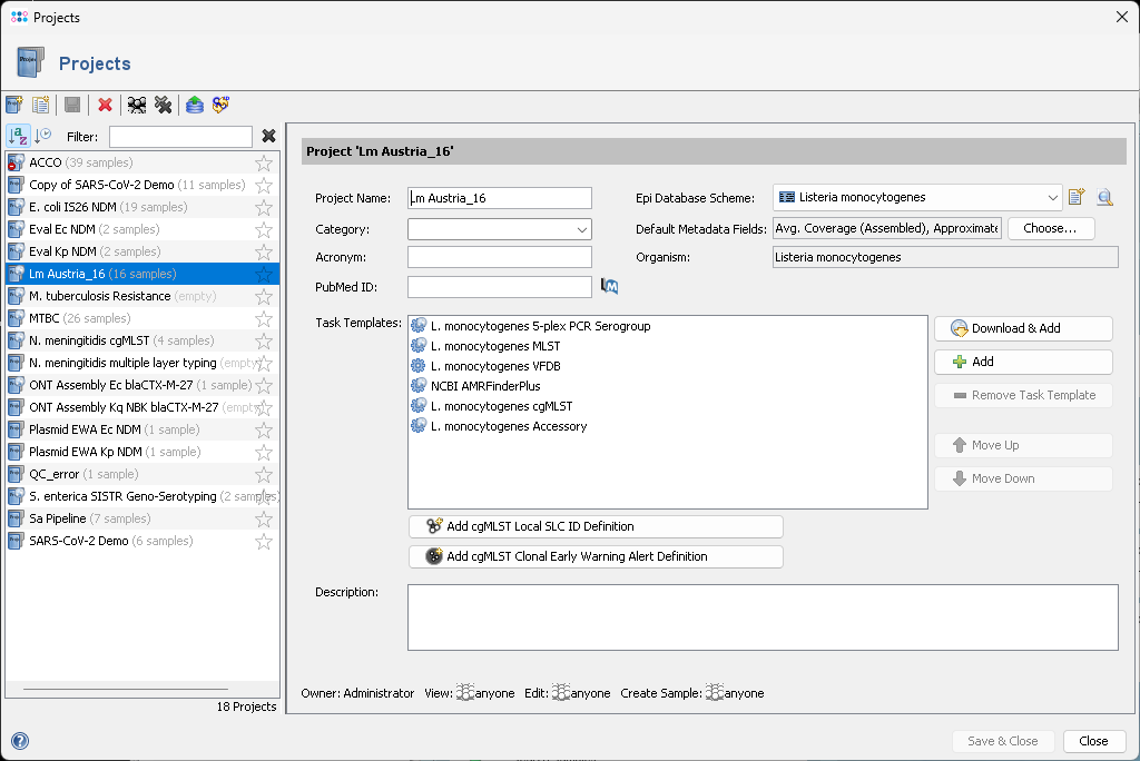 Further below the Task Templates can be selected for the Project. Task Templates define the sequence data processing tasks for each Sample of this project. They can be added from the Task Template Sphere by using the button Button16-WebDownload.png Download & Add or from the list of Task Templates that are already present in the local database by using the button Button16-Plus.gif Add.