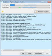 Monitoring Running PipelineWhen the pipeline is started, the progress window is shown. The progress window can be minimized to a tray icon. On the bottom of the window the following control buttons are available: