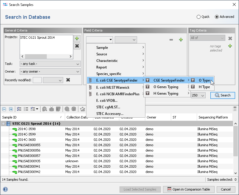 Those stored results can later be retrieved for a Comparison Table and when exporting to file. They can be also used as a 'Field Criteria' in the advanced mode of the sample search dialog. Some result fields of a sample (specified in the task templates) are also shown in the Result tab of the Sample Overview.