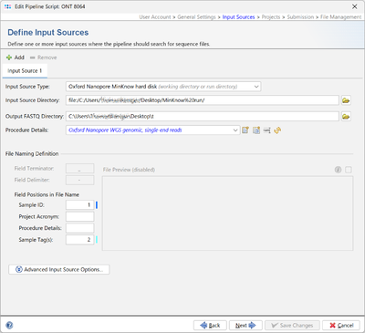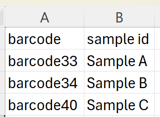 ContentsPrerequisitesPlease Note: Working with MinKNOW Run Data requires the Long Read Module (LRM) In order for the MinKNOW run data to be processed further in Ridom Typer, the setting Trim barcodes: On must be used. MinKNOW stores each run in a directory. A fastq_pass subdirectory contains itself barcodeXY subdirectories with multiple fastq.gz files. The file report_RUNNAME.json contains detail information about the run. Pipeline settingsWhen Oxford Nanopore MinKNOW hard disk is selected as Input Source Type an additional input field is available: Output FASTQ directory. The FASTQ-files for a MinKNOW sample are merged together and stored in a subdirectory of Output FASTQ directory that is named by the run id, e.g. 20241209_1142_MN30839_FBA87915_d4fdb8bb. Therefore this directory must be writeable for the current user. Note that Field Terminator and Field Delimiter cannot be edited when Oxford Nanopore MinKnow hard disk is selected and that the file preview is disabled. Running the pipelineA subdirectory named by the run ID is created in the output FASTQ directory. Merged FASTQ files, the report file and a sequence specification file (sequence_specification.spec) are written to this subdirectory. FASTQ files for a run that already has a subdirectory below the output FASTQ directory will be ignored by the pipeline. Sample SheetA sample sheet is used to assign a sample name to the barcodes. The sample sheet is stored in a file sample_sheet_ridom_typer.csv or sample_sheet_ridom_typer.xlsx in the ONT run directory. This file can be created manually or by using the sample sheet input window. The sample sheet file must contain at least two columns (with headers). The first column is used for barcodes (e.g. barcode01 ... barcode99), the second column contains the sample name. All other columns are ignored. The column headers can contain any name. Sample Sheet Input WindowIf a ONT run directory does not contain a file sample_sheet_ridom_typer.csv or sample_sheet_ridom_typer.xlsx and no run subdirectory below the output directory exists a sample sheet input window is opened when the pipeline is started. The window can contain several tabs if the sample data has to be entered for several runs. Enter the Sample names and choose the corresponding barcodes. The sample name may only contain the characters a-z, A-Z, 0-9 and -. After clicking OK in the sample sheet window the file sample_sheet_ridom_typer.csv is written into the ONT run directory. The run directory must be writable by the Windows user for this to work. If the sample sheet input window is open and the file sample_sheet_ridom_typer.csv in the run directory is written by another computer (e.g. on a network drive) the sample sheet for this run is removed from the window. If there are no more sample sheets to enter for the other directories, the window will close.