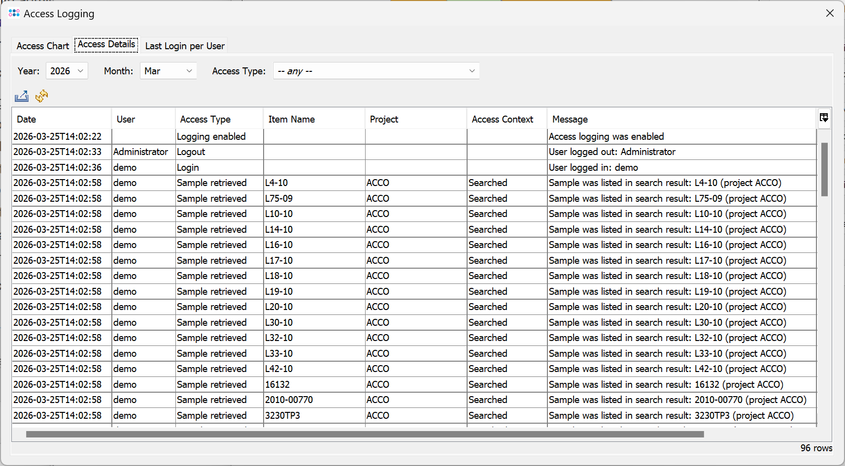 The access logging is disabled by default. It can be enabled and viewed by the Administrator (or any user with administration rights) by invoking the menu item Button16-SysAdminManager.png Administration | Server System Administration. The button Server Logging then opens a drop down menu with functions to Enable server access logging and to Show server access logging.