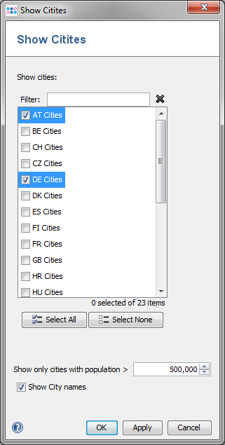 To remove cities from the map, click the Select None below the list and click OK.