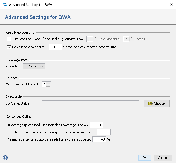 BWA is a reference genome assisted assembler for read data. It maps reads to a given reference genomes. BWA contains several algorithms, Ridom Typer supports BWA-SW and BWA-MEM. The BWA-MEM algorithm is recommended as it is much faster than BWA-SW. However, BWA-MEM is only available for Linux, so in Ridom Typer it is only supported on Linux and on Windows 10 with WSL installed. On Windows without WSL only the older BWA-SW is supported. BWA is used as part of the Ridom Typer Assembling Pipeline for remapping reads to de novo assemblies (SKESA/SPAdes) or to perform reference mapping. Reference mapping is only recommended for monomorphic organisms (e.g. M. tuberculosis) as results strongly depend on the similarity of the test draft-genome to the reference. Therefore a warning is shown, if BWA reference mapping is selected in a pipeline for non-monomorphic organisms with public cgMLST schemes. BWA can also be directly accessed using the menu Tools | Read Mapper (BWA). The reference mapper opens FASTQ-files that contain either single or paired reads. The input files can be quality trimmed and downsampled before mapping. The mapped reads and the reference sequence are stored in a BAM-file. ContentsQuality TrimmingThe reads can be processed before they are mapped. They can be automatically trimmed based on read quality and downsampled. BWA does its own trimming, so quality trimming is disabled by default. When trimming is enabled, reads are trimmed on both ends until the average base quality is better than the given value in a window of a selected number of bases. DownsamplingTo reduce the size of the output files and the time required for mapping, the input files can be downsampled. Downsampling randomly removes reads so that the given approx. size is obtained. If quality trimming is selected, downsampling is done on the trimmed reads. Depending on sequencing technology and read length a different downsampling coverage setting might be useful. For Illumina HiSeq/MiSeq data a downsampling to approx. 120 times the expected genome size worked well. Standard Settings (in pipeline and manual mode)
