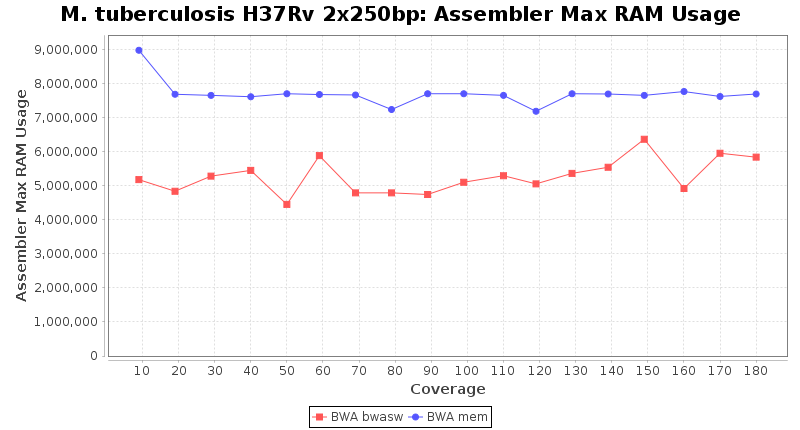 PostprocessingBefore a BAM file can be scanned by Ridom Typer, a consensus sequence is automatically calculated by the built in consensus caller. As BWA is known to create inacurrate mappings for low coverage data, the consensus calling procedure is configured to use a threshold of 5 as minimum coverage to call a non-ambiguous base, if the estimated average coverage (unmapped) is below 50. The required read support for a consensus base is 60%. Speed and MemoryThe following charts show the runtime and memory usage for mapping Illumina MiSeq 2x250bp sequence data of Mycobacterium tuberculosis strain H37Rv (NC_000962; 4.4 MBases genome) on an Intel Xeon system with 20 cores and 192 GB memory. Before reference mapping the read files were downsampled to different estimated coverages. The reference mapping was then performed with the two different BWA algorithms BWA-SW (red) and BWA-MEM (blue). In summary, reference mapping does not require huge amounts of memory and is overall much faster than de novo assembly. Versions and Open Source NoteOnly BWA version 0.6 is natively available for Windows, but the BWA-MEM algorithm is only supported since version 0.7. Therefore, Ridom Typer includes two different versions of BWA: Version 0.6 is used for BWA-SW (on Linux and on any Windows), and version 0.7 is used for BWA-MEM (on Linux and on Windows 10 with WSL installed). The BWA reference mapping function is a wrapper to an external BWA executable. This BWA executable is open source software that is licensed under the GNU General Public License version 3.0 (GPLv3, http://bio-bwa.sourceforge.net/). The native Windows version of BWA is from https://github.com/xied75/bwa. For more information on BWA, see: Li H. and Durbin R. (2010) Fast and accurate long-read alignment with Burrows-Wheeler Transform. Bioinformatics, 26: 589-95 [PubMed 20080505] and Li H. (2013) Aligning sequence reads, clone sequences and assembly contigs with BWA-MEM. arXiv. arXiv:1303.3997 [q-bio.GN] [arXiv]. |