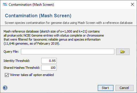 When the dialog is confirmed with Start, Mash Screen is started to find matches for the query in the Mash reference database. The resulting matches are filtered by thresholds for Identity and Shared-hashes. The default thresholds (Identity >=0.95, Shared-hashes >=100) can be changed.