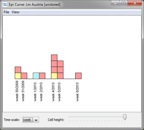 The Epi Curve diagram can be created from the Comparison Table. It shows the distribution of Samples (y axis) during a time period (x axis). Sample groups are indicated by colors.