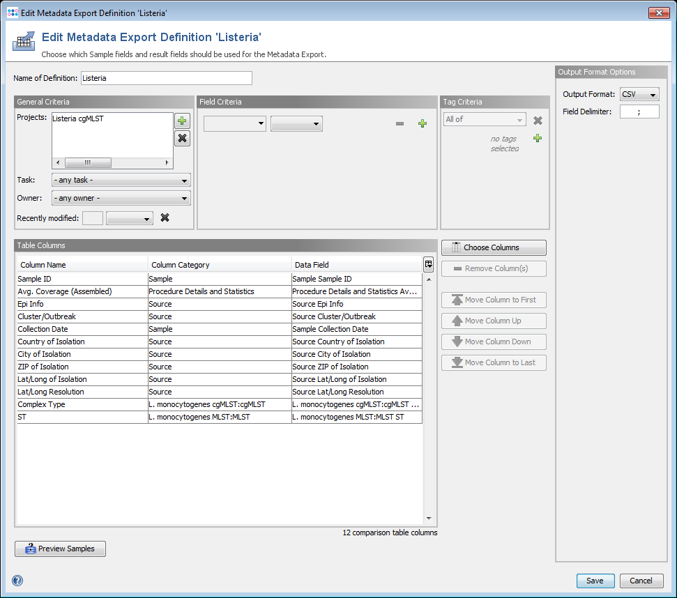 • The General Criteria, Field Criteria and Tag Criteria-boxes allow to define which Samples should be included into the data export.