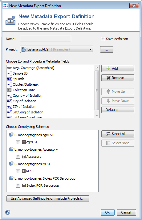 • The new Metadata Export Definition will include all samples for the selected project. To use a more limited search criteria the Use Advanced Settings button can be clicked.