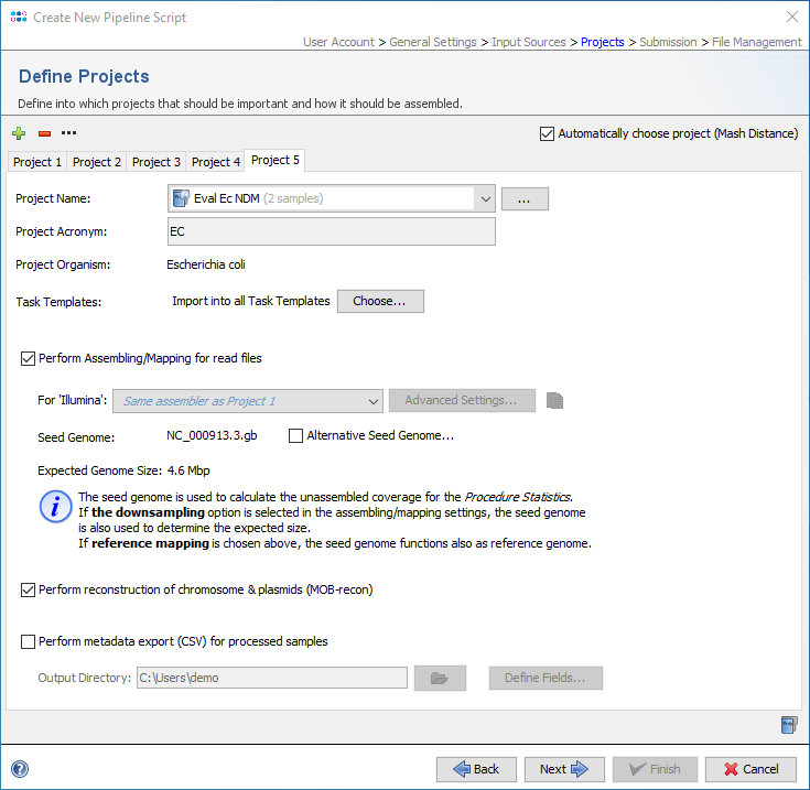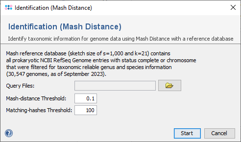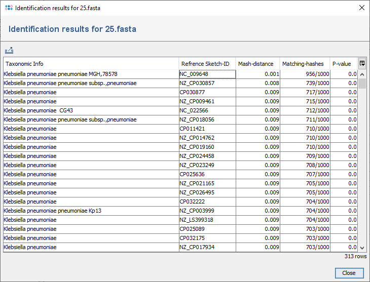 Pipeline Automatic Project Choosing (Mash Distance)In the section Define Projects of a pipeline script, the option Automatically choose project (Mash Distance) can be enabled to choose the correct project for a processed sample automatically. If enabled, Mash Distance is started to find the closest match for the input file of a sample (FASTA/GB/BAM/ACE or first FASTQ file) in the Mash reference database. If a match above the thresholds (Mash-distance <=0.1, Matching-hashes >=100) is found, the project that provides task templates for that species is automatically chosen. This option can only be used if only one project per species is defined in the pipeline. If no matches above the threshold were found or if no project was found in the pipeline script for a matching species, the sample processing fails and the pipeline continues with the next sample. To be able to handle closely related and/or synonymous species, Mash equivalency groups have been defined for some species. Distinction between Escherichia and ShigellaIf the Top Match of the Mash species identification is Escherichia or Shigella, the function will try to further distinguish between these closely related genera using the presence of ipaH and Shigella-specific STs as defined by ShigaPass [PubMed 36951906]. If the genus cannot be determined this way, the species will be assigned based on the If species identification fails settings in the pipeline script. Tools Menu Identification (Mash Distance)The menu function Tools | Genome Utilities | FASTQ Species ID (Mash Distance) can be used for rapid identification of a read file (FASTQ) or an assembly contigs file (FASTA/GB/BAM/ACE). For read data, the forward reads file is recommended to be used. When the dialog is confirmed with Start, Mash Distance is started to find matches for the query in the Mash reference database. The resulting matches are filtered by thresholds for Mash-distance and Matching-hashes. The default thresholds (Mash-distance <=0.1, Matching-hashes >=100) can be changed. The result is shown in a dialog window containing an exportable table with all matches above the defined thresholds. By selecting a row and right-clicking the entry can be browsed at the NCBI website. The table has the following columns: