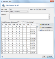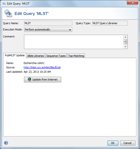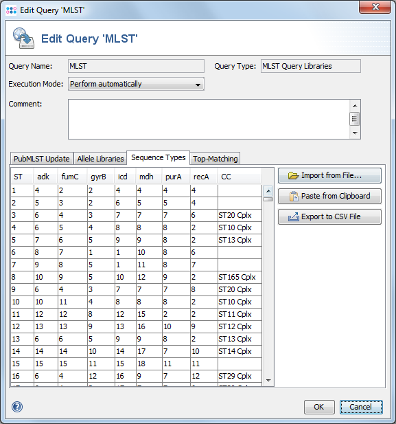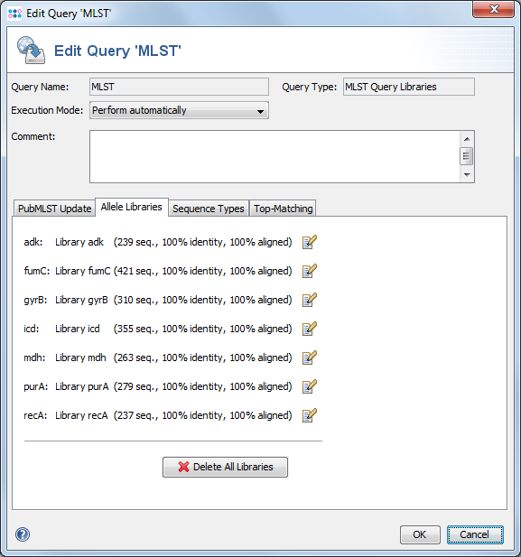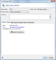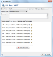 MLST library queries are used to define the classic 5-7 loci MLST allele libraries. For most allelic schemes, the libraries can be automatically downloaded. Plus, the MLST library query can also be defined manually with custom libraries imported from local files.