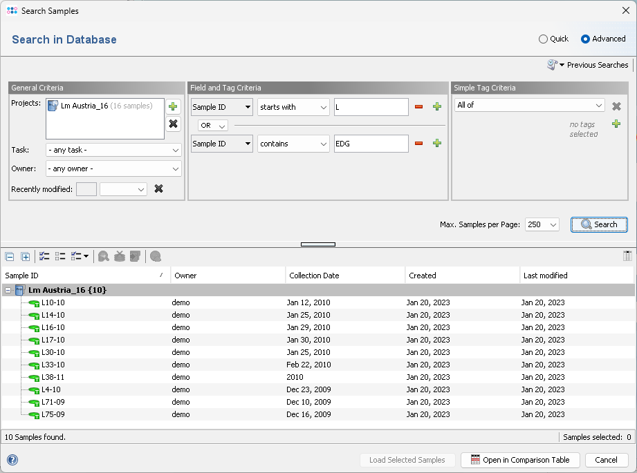 - The Simple Tag Criteria area allows to limit the search to samples that have or don't have a specific tags assigned.