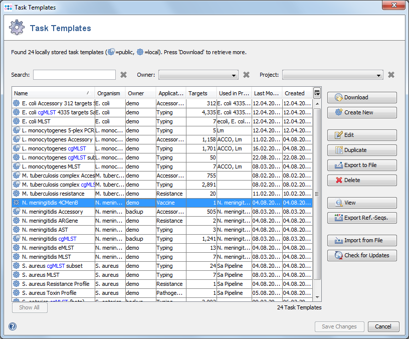 Select Button16-TaskTemplate.png Option | Task Templates to see a table with all Task Templates on the server (that are visible for the current user). Use the three fields to filter the table by a simple text (appearing in any of the columns), by the owner of a Task Template, or a project in which it is used. The icon left of the task template shows a small mark for public allele typings (PublicTaskTemplate.png) and for outdated or deprecated (OutdatedTaskTemplate.png) task templates.