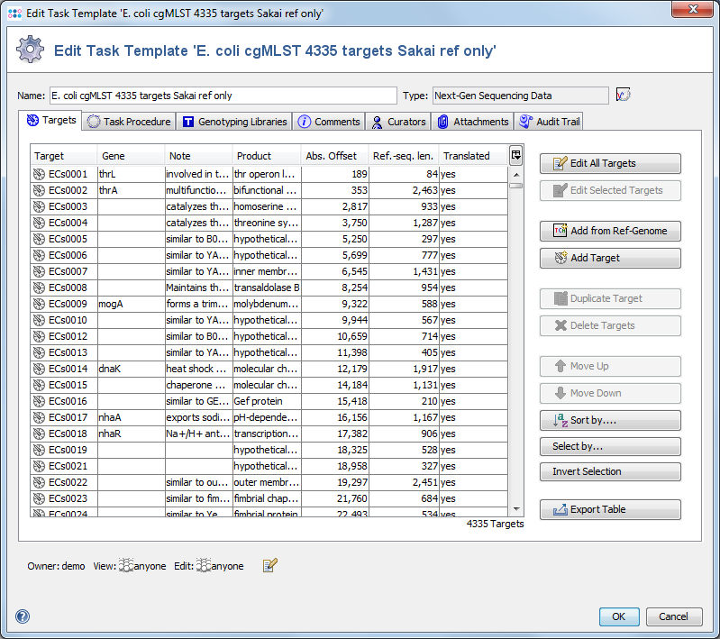 The first tab in the Task Template editor shows a table with all targets that are defined in this Task Template. If the targets were created from a genome sequence, further columns can be shown using the small columns selection button Button16-jxtable columns.png in the upper right corner of the table.