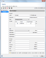 Minimally a login name, a password, and the role for the new user must be entered/selected. Furthermore, the first and last name of the new user should be entered.