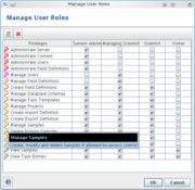 Each user has an associated role in the system. For each role certain rights are defined, like creating users, creating projects, or creating samples. The predefined roles are: