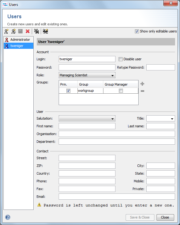 As managing scientist you can only create users with the associated roles scientist, analyst, or visitor. Group memberships of a new user cannot be changed by them; the new user is automatically a member of the same groups as the managing scientist.