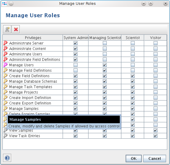 The system administrator can also define new roles using the menu item Button16-UserRole.png Administration | User Roles. Each role is defined by the privileges that are granted to the user. The list of privileges is shown in the first column of the dialog. Move the mouse over a privilege to see a short description in the tooltip.