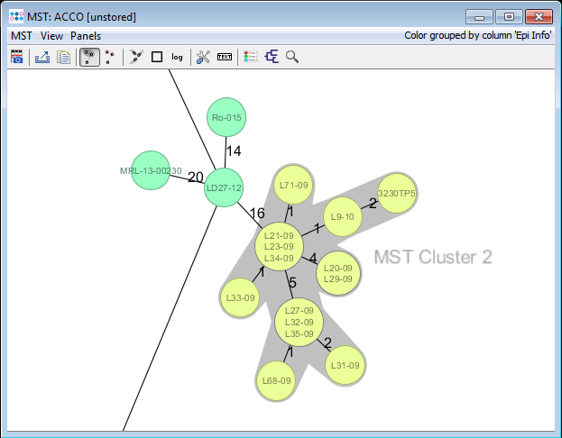Example of a MST Cluster with 14 Samples, highlighted by gray background color. The cluster label shows the name of the cluster, 'MST Cluster 2'. The cluster distance threshold is by default 10 alleles difference, i.e., clustering threshold (L. monocytogenes).