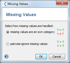 For a lower number of columns for distance calculation, (e.g. for MLVA data or MLST data), the missing values are an own category option is recommended. For a larger number of columns (e.g. MLST with hundreds of targets) the pairwise ignore missing values option is recommended.