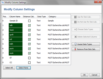 To change which columns are used for distance calculation, select the corresponding rows in the table and click the CheckDistance.png Use for Dist.Calc.-button. Likewise, use the UncheckDistance.png Do Not Use for Dist.Calc.-button to remove a column from distance calculation. Both commands are also available in the context menu.