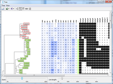 Screenshot of the Phylogenetic Tree Window. Selected Samples are highlighted by a red dotted outline. Table data is included in the tree image.