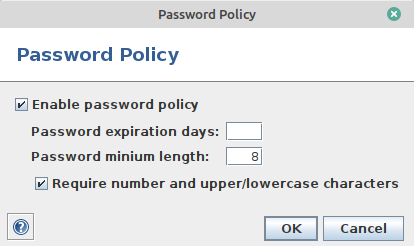 The policy for passwords can be defined by the Administrator in the user managing dialog: