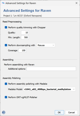 The assembler options dialog in the pipeline script allows to specify the pre- and postprocessing, and to set additional Raven parameters.