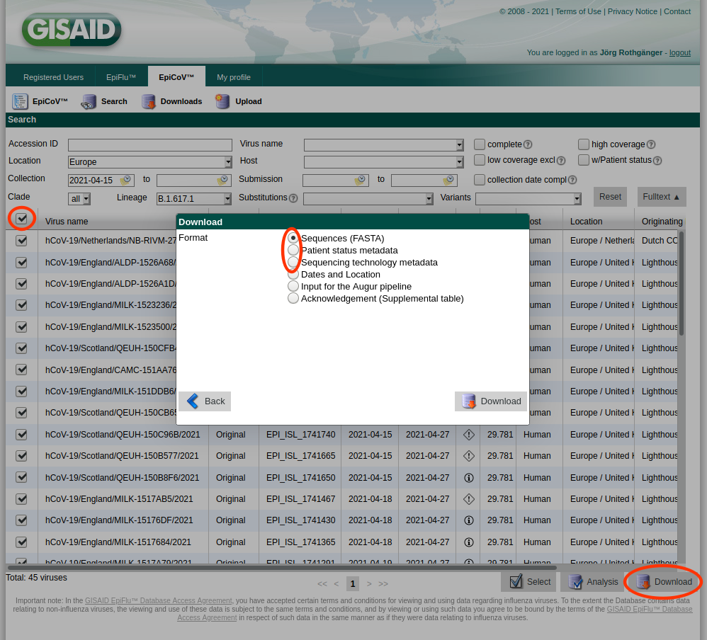 • Step 1: Log-in to GISAID, open Search, enter the search criteria of interest, select the those filtered entries by checking the checkbox in the column header, and push the Download button. Please note only 10,000 entries at once can be downloaded via this mechanism. In the upcoming Download dialog download the Sequences (FASTA) file by pushing the Download button. Push the Download button again, select this time the Patient status metadata file, and download the file. Once done, push the Download button again, select this time the Sequencing technology metadata file, and download this file too. The three just downloaded files must not be renamed and moved to a separate directory.