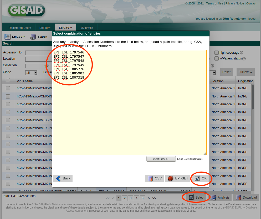 • Step 9: Copy the EPI_ISL_yxz numbers into the clipboard, log-in to GISAID, open Downloads, and push the Select button. Paste from the clipboard in the upcoming form the EPI_ISL_yxz numbers, press the OK button, and next press the Download button. Next select in the upcoming dialog the option Patient status metadata and save the file by pushing the Download button of this dialog.