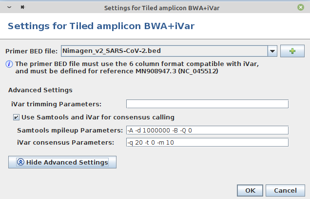 • Step 7: In the panel Define Projects choose the project and choose as assembler Tiled amplicon BWA+iVar (reference mapping). Press the Settings... button right of the assembler box. A primer BED file must be selected here. Primer BED files for ARTIC v3, Illumina AmpliSeq, NimaGen EasySeq RC-PCR v3, and Qiagen QIAseq SARS-CoV-2 Primer Panel and QIASeq DIRECT SARS-CoV-2 are provided. Either select one of the provided files or add via the + button a BED file with the primer positions for another protocol. Below the BED file dialog, the Advanced Settings... can be used to change iVar and Samtools mpileup command line parameters. For primer trimming Ridom Typer applies by default the -e option of iVar trim, i.e., reads with no primers will not be excluded from further analysis (e.g., ARTIC, Illumina AmpliSeq, or Qiagen QIAseq SARS-CoV-2 Primer Panel). Only in case that the amplicons are not fragmented during library preparation this option should not be used (e.g., NimaGen EasySeq RC-PCR, or Qiagen QIASeq DIRECT SARS-CoV-2). For provided BED files the -e option is set automatically correct. For Samtools mpileup mostly default parameters are used. The only non-default parameters used are do not discard anomalous read pairs (-A), disable per-base alignment quality (-B), skip bases with base quality smaller than 0 (-Q 0), and especially the maximum per-file coverage -d 1000000. The coverage of the pool amplicons can vary more than 100x in tiled amplicon approaches. Therefore, the value of the -d parameter should be at least 5-10x greater than the Avg. Coverage (Unassembled). For consensus calling by default the minimum quality score threshold (-q 20), minimum coverage to call consensus (-m 10), and minimum frequency threshold (-t 0.7) parameter values are applied. For stricter consensus calling, e.g., a called base must make up at least 90% presence at a position, the latter parameter must be changed to -t 0.9. For further details and other parameters it is referred to the iVar manual. All by Ridom Typer employed iVar and Samtools mpileup parameters are logged and can be found in the Assembly Post-processing row of the samples Procedure tab.