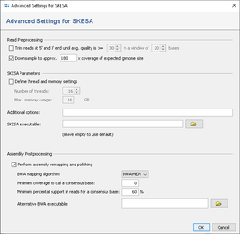 The number of cores (by default all) and the maximum amount of memory that should be used can be specified here. Furthermore, additional command line parameters for SKESA can be defined here (see SKESA manual).