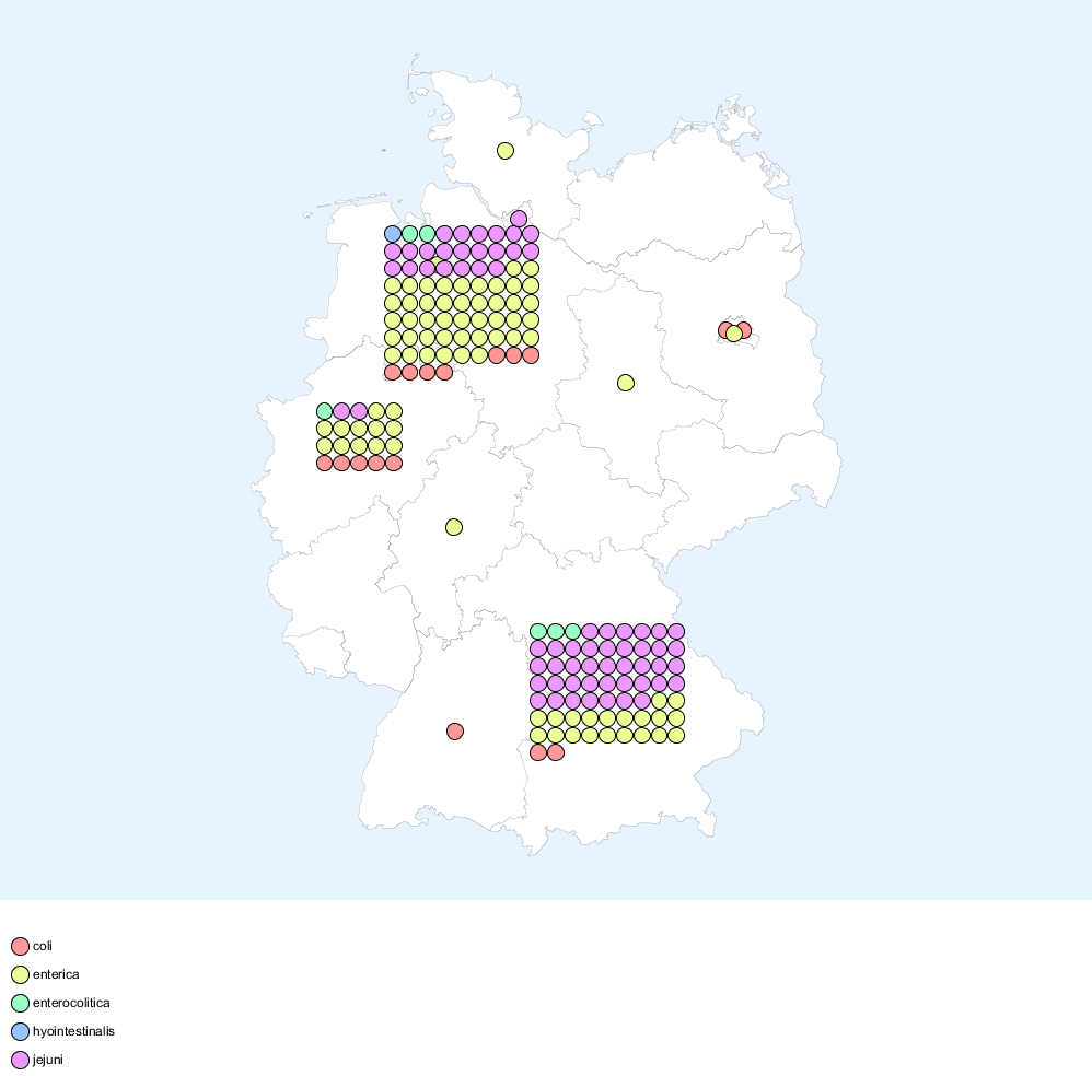 • as small circles, where multiple circles are drawn filled with the corresponding group colors