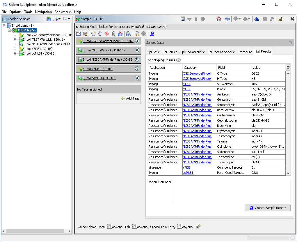 Create Sample Report: Creates a PDF report for the Sample. Created reports are listed at the top of the Results panel.